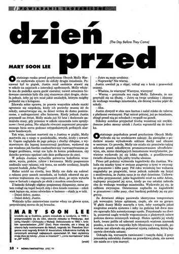 2. Небольшой рассказ американской писательницы Мэри Сун Ли/Mary Soon Lee, который называется в оригинале “The Day Before They Cam” (1998, “Interzone”, № 133, July; 1999, ант. “Year’s Best SF 4”; 2002, авт. сб. “Ebb Tides and Other Tales”) перевел на польский язык под названием “Dzień przed/Предыдущий день” АРКАДИУШ НАКОНЕЧНИК/Arkadiusz Nakoniecznik (стр. 10-11). Иллюстраций нет.