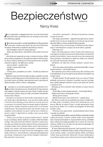 13.1. Рассказ американской писательницы Нэнси Кресс/Nancy Kress, который называется в оригинале “Safeguard” (2007, ”Asimov’s Science Fiction”, Jan.; 2012, авт. сб. “Fountain of Age: Stories Asimov’s Readers), перевел на польский язык под названием “Biezpieczeństwo/Безопасность” АДАМ ВИХЕР/Adem Wicher (стр. 17—28). Иллюстрации РАССЕЛ МОРГАН/Russel Morgan.