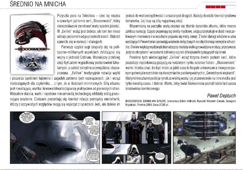 Как в литературе, так и в комиксе появляется много интересных историй, выдержанных в конвенциях киберпанка, фэнтези или твердой НФ. Попыткой изменения существующей ситуации может быть серия “Биокосмосис”, первый том которой только что появился в продаже. Имеется ли возможность того, что это с размахом скроенное произведение польских творцов выбьется на поверхность костенеющего жанра? Безусловно да!