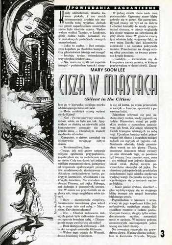 Первый рассказ, который называется в оригинале “Silent in the Cities” (1996, “Aboriginal SF”, Fall; 2002, авт. сб. “Ebb Tides and Other Tales”) перевела на польский язык под названием “Cisza w miastach/Тишина в городах” МАГДА ГАВЛИК/Magda Gawlik (стр. 3-5). Иллюстрации МОНИКИ СВЕТЛИК/Monika Świetlik.