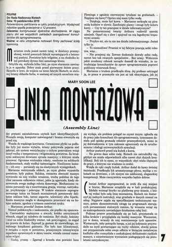 Второй рассказ, который называется в оригинале “Assembly Line” (1995, “Interzone”, Aug.; 2002, авт. сб. “Ebb Tides and Other Tales”), перевел на польский язык под названием “Linia montaźowa/Линия сборки” АРКАДИУШ НАКОНЕЧНИК/Arkadiusz Nakoniecznik (стр. 6-11). Иллюстрации МАРЕКА АДАМИКА/Marek Adamik.