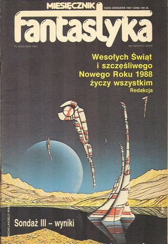 Ну вот мы и добрались до двенадцатого номера «Фантастыки» за ее пятый подписной год. Его делает та же команда, которая делала предыдущий номер. Адрес тот же, те же два телефонных номера. Объем журнала, бумага, типография – те же. Tираж журнала не изменился -- 150 тысяч экземпляров. В «Галерее» в этом номере представлены репродукции работ двух польских художников: ПЕТРА ЛОПАЛЕВСКОГО/Piotr Łopalewski (внутренняя сторона передней обложки и стр. 10, 17, 47, 50 и БОРИСА БИЧА/Borys Bicz (внутренняя сторона передней обложки и стр. 7). На передней обложке на фоне репродукции работы итальянского художника МИКЕЛАНДЖЕЛО МИАНИ/Michelangelo Miani – поздравление читателей журнала с рождественскими и новогодними праздниками. На задней обложке -- реклама «дочернего» журнала «Фантастыки»«Mała Fantastyka».