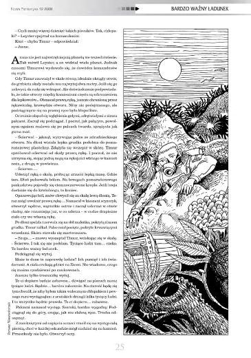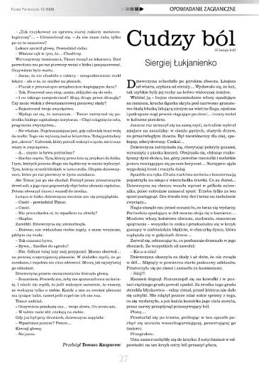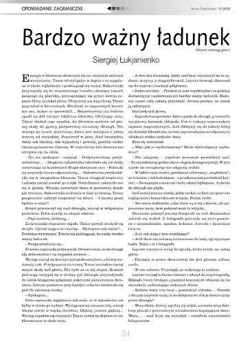 13.2. В номере напечатаны переводы двух рассказов российского писателя Сергея Лукьяненко. Рассказ, который в оригинале называется «Очень важный груз» (2002, авт. сб. «Атомный сон»; 2008, авт. сб. «Донырнуть до звезд»; 2022, авт. сб. «Именем Земли») и рассказ, который в оригинале называется «Чужая боль» (1987, «Заря»; 1989, ант. «Возвращение динозавров»; 2007, авт. сб. «Пристань желтых кораблей»; 2022, авт. сб. «Именем Земли»), перевел как (соответственно) “Bardzo ważny ładunek” (стр. 24—27) и “Cudzy ból” (стр. 27—29) ТОМАШ КАСПАРОВ/Tomasz Kasparow. Иллюстрация ТОМАША НЕВЯДОМСКОГО/Tomasz Niewiadomski.