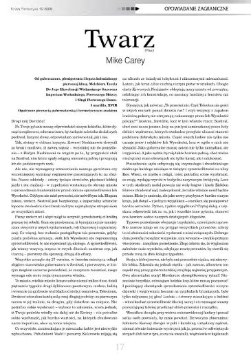 13.1. Рассказ английского писателя Майка Кэри, который носит в оригинале название “Face” ( 2008, ант. “Subterranean: Tales of Dark Fantasy”; 2019, “The Complete Short Stories of Mike Carey”), перевела на польский язык под названием “Twarz/Лицо” ПАУЛИНА БРАЙТЕР/Paulina Braiter (стр. 17—23). Иллюстрации МАРЦИНА КУЛАКОВСКОГО/Marcin Kułakowski.