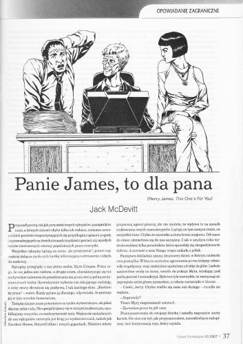 11.2. Рассказ американского писателя Джека Макдевитта/Jack MacDevitt, который называется в оригинале “Henry James, This One’s For You” (2005, ”Subterranean”, Iss. 2; 2006, авт. сб. “Outbound”; 2009, авт. сб. “Cryptic: The Best Short Fiction of Jack MacDevitt”) перевел на польский язык под названием “Panie James, to dla pana/Господин Джеймс, это для вас” РАФАЛ МОНЧИНЬСКИЙ/Rafał Mączyński (стр. 37–40). Иллюстрации НИКОДЕМА ЦАБАЛЫ/Nikodem Сabała.