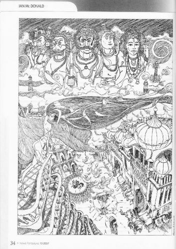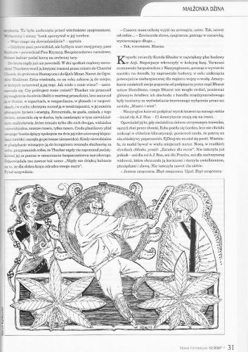 11. 1. Рассказ британского писателя Йена Макдональда/Ian McDonald, который называется в оригинале “The Djinn’s Wafe” (2006, “Asimov’s Science Fiction”, July; 2007, ант. “The Best SF and Fantasy of Year", v. 1; 2009, авт. сб. “Cyberabad Days”), перевел под названием “Małżonka dżina/Супруга джинна” ГЖЕГОЖ КОМЕРСКИЙ/Grzegorz Komerski (стр. 17-36). Иллюстрации МАРЦИНА КУЛАКОВСКОГО/Marcin Kułakowski.
