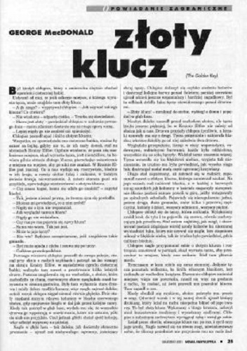 3. Рассказ британского (шотландского) писателя Джорджа Макдональда/George MacDonald, который называется в оригинале “The Golden Key” (1867, авт. сб. “Dealing With the Fairies”; 1890, авт. сб. “The Light Princess”, многочисленные переиздания), перевела на польский язык под названием “Złoty klucz/Золотой ключ” ИВОНА ЖУЛТОВСКАЯ/Iwona Żółtowska (стр. 25-34). Иллюстрации ПЕТРА КОВАЛЬСКОГО/Piotr Kowalski.