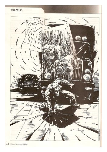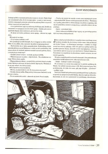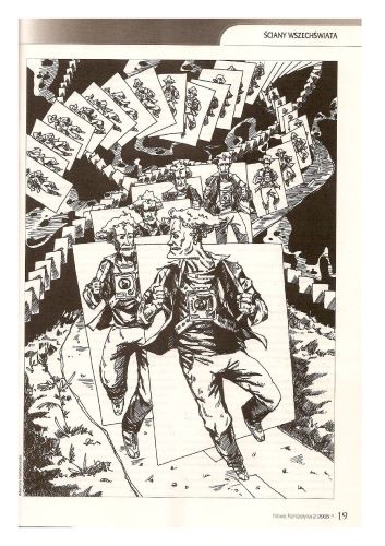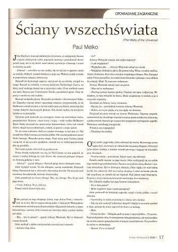 Повесть американского писателя Пола Мелкоу/Paul Melko, которая называется в оригинале “The Walls of the Universe” (2006, ”Asimov’s Science Fiction, Apr.-May; 2008, авт. сб. “Ten Sigmas and Other Unlikelihood’s”) в переводе на польский язык МАЦЕЙКИ МАЗАН/Maciejka Mazan и под названием “Ściany Wszechświata/Стены Вселенной” публикуется на стр. 17 – 40. Иллюстрации МАРЦИНА КУЛАКОВСКОГО/Marcin Kułakowski.