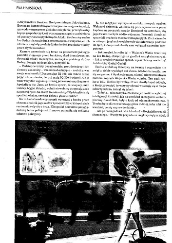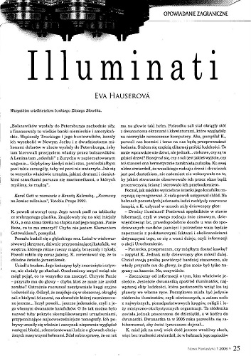 14.2. Рассказ чешской писательницы Евы Гаусеровой/Ewa Hauserová, который называется в оригинале “Illuminati” (2002, ант. “2101: Česka odysea”), перевела на русский язык под тем же названием “Illuminati/Иллюминаты” АННА ДОРОТА КАМИНЬСКАЯ/Anna Dorota Kamińska (стр. 23—32). Иллюстрации ДАРИУША АДАМСКОГО/Dariusz Adamski.