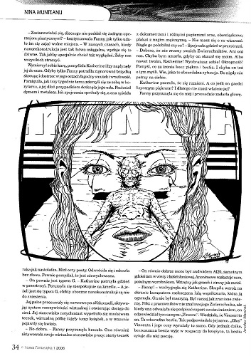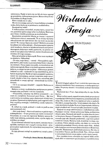 14.3. Рассказ канадской писательницы Нины Мунтяну/Nina Munteanu, который называется в оригинале “Virtually Yours” (2002, “Hadrosaur Tales”, vol. 15; 2004, “Neo-Opsis SF Magazine”, Iss. 3; 2021, “Speculative North”, Dec.), перевела на польский язык “Wirtualnie Twoja/Виртуально твоя” СИЛЬВИЯ СОСИНЬСКАЯ/Sylwia Sosińska (стр. 32—36). Иллюстрации ЯРОСЛАВА МАРЦИНЕКА/Jarosław Marcinek.