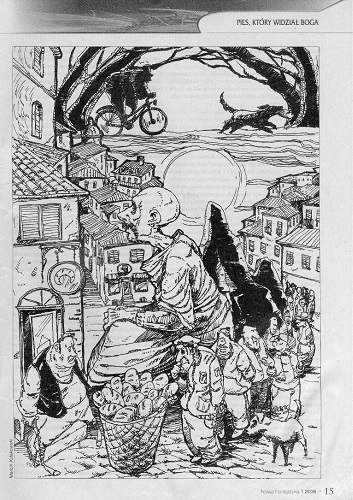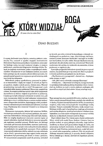 14.1. Рассказ итальянского писателя Дино Буццати/Dino Buzzati, который называется в оригинале “Il cane che ha visto Dio” (1954, 1984, авт. сб. “Il crollo della Baliverna”; 1958, 1968, 1969, 1971, 1994, 1995, авт. сб. “Sessanta racconti”; 1968, 1994, “Le boutique del mistero”; 1982, “180 racconti”) перевела на польский язык под названием “Pies który widział Boga/Пес, который видел Бога” ИОАННА ВАЙС/Joanna Wajs (стр. 13—24). Иллюстрации МАРЦИНА КУЛАКОВСКОГО/Marcin Kułakowski.