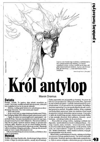 7. В рубрике «Из польской фантастики» печатается большая новелла Марека Орамуса/Marek Oramus «Król antylop/Король антилоп». Три иллюстрации ТОМАША ТОМАШЕВСКОГО/Tomasz Tomaszewski. Позже рассказ вошел в состав авторского сборника Орамуса «Rewolucja z dostawą na miejsce/Революция с доставкой на место» (2002). На русский язык рассказ не переводился. Ни карточки на рассказ, ни биобиблиографии автора на сайте ФАНТЛАБ нет.