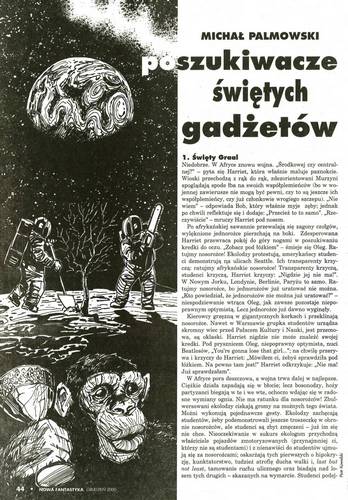 Рассказ “Poszukiwacze świętych gadżetów/Искатели святых гаджетов” (стр. 44-48) написал Михал Пальмовский/Michał Palmowski. Иллюстрации ПЕТРА КОВАЛЬСКОГО/Piotr Kowalski. Это довольно-таки мрачный гротеск, в котором и искателям приключений, и спасителям отечества-человечества, и взбалмошным дамочкам, и… короче, всем достается на орехи… Ни биобиблиографии писателя, ни карточки на этот его рассказ на сайте ФАНТЛАБ нет.