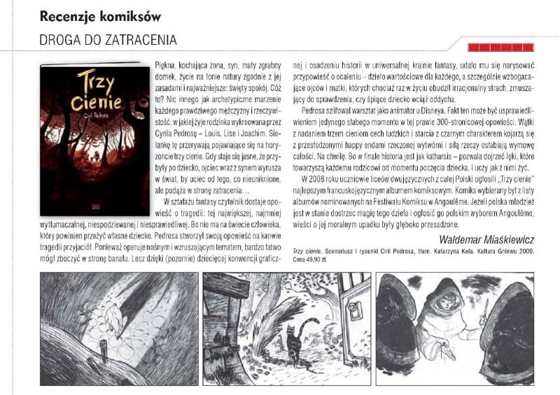 В 2008 году учащиеся двуязычных средних школ по всей Польше признали "Три тени" лучшим франкоязычным альбомом комиксов. Комикс был избран из списка комиксов, номинированных на Фестивале комиксов в Ангулеме. Если польская молодежь способна увидеть волшебство этой работы и объявить ее польским выбором Ангулема, то обвинения ее в моральном упадке явно преувеличены.