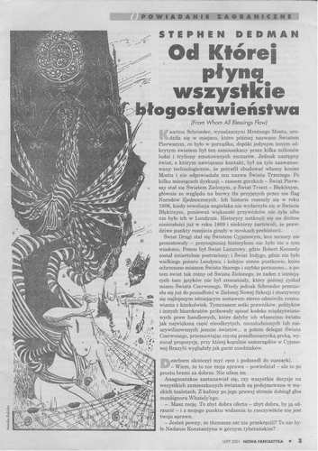1. Рассказ австралийского писателя Стивена Дэдмена/Stephen Dadman, который называется в оригинале “From Whom All Blessing Flow” (1995, ”Asimov’s Science Fiction”; 1999, ант. “Centaurus: The Best of Australian Science Fiction”; 1999, 2009, авт. сб. “The Lady of Situations”) перевел на польский язык под названием “Od Której płyną wszystkie błogosławieństwa/От Kоторой плывут все благословения” МАРЦИН ВАВЖИНЬЧАК/Marcin Wawrzyńczak (стр. 3-12). Иллюстрации МОНИКИ РОКИЦКОЙ/Monika Rokicka.