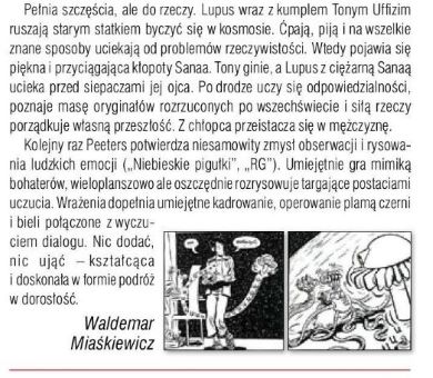 ПЕТЕРС неспешно набирает обороты. Он играет взглядами, флэшбеками, сновидениями и большим количеством внутренних монологов Люпуса только для того, чтобы время от времени внезапно и неожиданно перебросить историю на новые рельсы. Несмотря на то, что действие происходит в космосе, фантастика является лишь фоном. Самое главное – это Люпус, его растерянность и незрелость, и то, как он решает проблемы. Каждое событие, каждый поворот, каждый герой – это ступенька на пути к зрелости космического волка. Комикс странный, полный сюжетных обманов, смутных наркотических видений, недосказанностей и ложных зацепок. Действие поддерживается интересной, последовательной, мягкой и приятной глазу линией. Эстетическое использование черно-белого цвета делает комикс графически совершенным. Остается надеяться, что в оставшихся двух томах ПЕТЕРС не снизит планку и “Lupus” продолжит удивлять. Издатель также может удивить и завершить работу быстрее, чем за восемь лет.