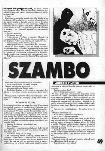 Рассказ ”Szambo/Выгребная яма” (стр. 49-56) написал Анджей Пилипюк/Andrzej Pilipiuk – в те годы студент истфака (отделение археологии) Варшавского университета, незадолго до этой публикации дебютировавший в журнале “Fenix” рассказом “Hiena/Гиена” -- об экзорцисте-любителе. Автор иллюстраций КШИШТОФ ГАВРОНКЕВИЧ/Krzysztof Gawronkiewicz.