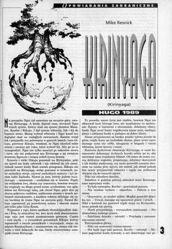 1. Рассказ американского писателя Майка Резника/Mike Resnick, который называется в оригинале ”Kirinyaga” (1988, “The Magazine of Fantasy and Science Fiction”, Nov.; 1989, ант. “The Year Best SF: Sixth Annual Collection”; 1992, авт. сб. “Kirinyaga”) перевела на польский язык под тем же названием «Kirinyaga/Кириньяга» ПАУЛИНА БРАЙТЕР/Paulina Braiter (стр. 3-110). Иллюстрации АНДЖЕЯ ГЖЕХНИКА/Andrzej Grzechnik. «Читать этот рассказ – все равно, что бороться с коварным дьяволом, все тело которого смазано маслом; он сильнее, легко выворачивается из любого хвата, дразнит, бросает с размаху на мат и снисходительно ждет, когда ты, болезненно морщась, встанешь. Текст выглядит манифестацией жесткого историографического цинизма – хочется поймать рассказчика и вздернуть на веревке на первом же попавшемся суку, а затем чуточку ослабить петлю, чтобы он, отдышавшись и малость поверещав, отрекся от своей теории. Но тут же ловишь себя на мысли – а может, Резник и добивается именно такого эмоционального отклика?..» (Мацей Паровский)… И это седьмая публикация писателя в нашем журнале (предыдущие шесть см. “Fantastyka” № 10/1987; “Nowa Fantastyka” № № 6/1991, 10/1992, 12/1993, 8/1994, 10/1994).