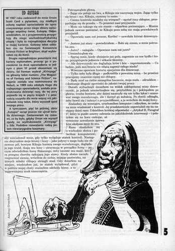 2. Новеллу американской писательницы Кристин Кэтрин Раш/Kristin Kathryn Rusch, которая называется в оригинале “Dancers like Children” (1991, “The Magazine of Fantasy and SF”, Sept.; 2002, авт. сб. “The Retrieval Artist and Other Stories”), перевела на польский язык под адекватным названием “Tancerze jak dzieci/Танцоры как дети” КИНГА ДОБРОВОЛЬСКАЯ/Kinga Dobrowolska (стр. 3-16, 25-26). Иллюстрации КАСИ МРОЖЕВСКОЙ/Kasia Mrożewska и МАЖЕНЫ КАВАЛЕРОВИЧ/Marzena Kawalerowicz. Танцоры – это инопланетная раса разумных существ. На их планете живут также земные колонисты, внешне вполне мирно сосуществуя с аборигенами. Но однажды в колонии происходит нечто страшное… И это вторая встреча с писательницей на страницах нашего журнала (первую см. № 9/1992).