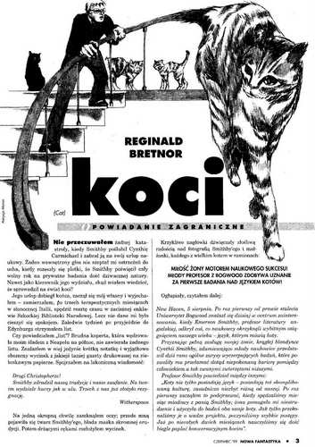 1. Рассказ американского писателя Pеджинальда Бретнора/Reginald Bretnor, который называется в оригинале “Kat” (1953, “The Magazine of Fantasy and Science Fiction”, Apr.; 1982, ант. “The Eureka Years”; 1997, авт. сб. “The Timeless Tales of Reginald Bretnor”) перевела на польский язык под названием “Koci/Кошачий” ДАНУТА ГУРСКАЯ/Danuta Górska (стр. 8-10). Иллюстрации ПАТРИЦИИ МОРАН/Patrycja Moran.