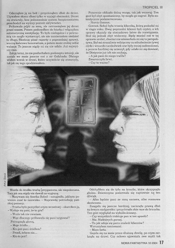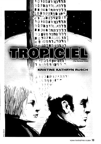 6. Повесть американской писательницы Кристин Кэтрин Раш/Kristine Kathryn Rusch, которая называется в оригинале ”The Retrieval Artist” (2002, “Analog Science Fiction and Fact”, Junie; 2002, авт. сб. “The Retrieval Artist and Other Stories”; 2012, авт. сб. “The Retrieval Artist; A Retrieval Short Stories”;) перевел на польский язык под названием “Tropiciel/Следопыт” МИХАЛ ЯКУШЕВСКИЙ/Michał Jakuszewski (стр. 13--33). Иллюстрации АРТУРА СИТНИКА/Artur Sitnik.