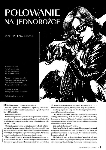 15.1. Рассказ “Polowanie na jednorożce/Охота на единорога” написала Магдалена Козак/Magdalena Kozak (стр. 45--56). Иллюстрации ТОМАША ЕНДЖЕËВСКОГО/Tomasz Jędrzejowski.