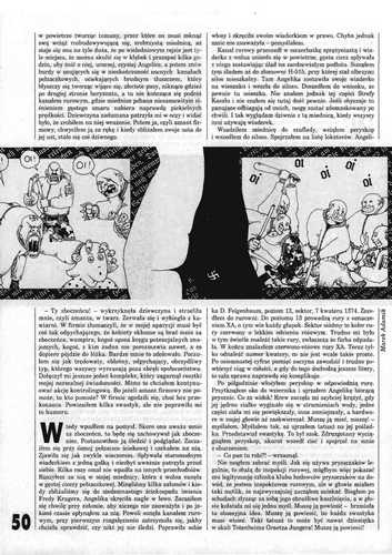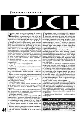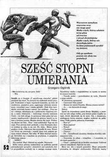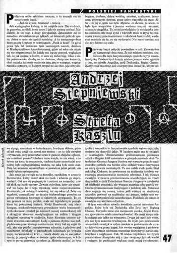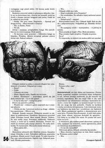 6. В этой же рубрике напечатан рассказ Анджея Стемпневского/Andrzej Stępniewski «Strefa Kaszlu/Зона Кашля», где автор «находит в фантастической и параноидальной Зоне Кашля те самые лихорадочные споры, которые будоражат нынешнее польское общество, изливаясь со страниц газет и пачкая стены надписями» (Мацей Паровский). (стр. 47-51). Иллюстрации ЯКУБА ЩЕНСНОГО/Jakub Szczęsny.