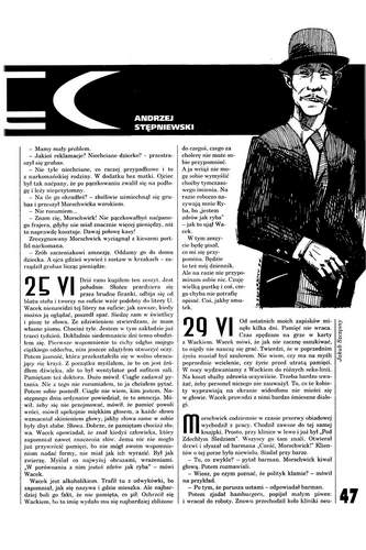 5. В рубрике «Из польской фантастики» размещена очередная порция литературных миниатюр следующих авторов: Конрада Баньковского/Konrad Bańkowski; Гжегожа Касдепке/Grzegorz Kasdepke; Яся Рошковского/Jaś Roszkowski; Давида Брыкальского/Dawid Brykalski; Конрада Шеромского/Konrad Szeromski (стр. 44-46). Иллюстрации МАРЕКА АДАМИКА/Marek Adamik.