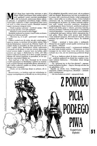 7. И еще одна публикация в этой же рубрике: юмористический рассказ Эугенюша Дембского/Eugeniusz Dębski «Z powodu picia podlego piwa/Из-за пития (Нахлебавшись) дрянного пива» (стр. 51-56). Иллюстрации АНДЖЕЯ ГЖЕХНИКА/Andrzej Grzechnik. Это очередной рассказ о приключениях веселого и смекалистого авантюриста Хонделика, с которым постоянным читателям журнала уже приходилось встречаться на его страницах (см. № 5/1993).
