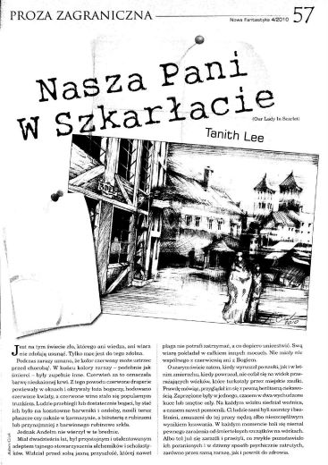 18.2. Рассказ английской писательницы Танит Ли/Tanith Lee, который называется в оригинале “Our Lady on Scarlet” (2009, ”Realms of Fantasy”, 2018, ант. “Venus Burning: Realms – The Collected Short Stories from Realms of Fantasy”) перевела на польский язык под названием “Nasza Pani w Szkarłacie/Богородица в пурпуре” ЭЛЬЖБЕТА ГЕПФЕРТ/Elżbieta Gepfert (стр. 57--). Иллюстрации АДАМА ЦЮКА/Adam Ciuk.
