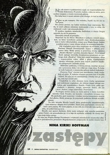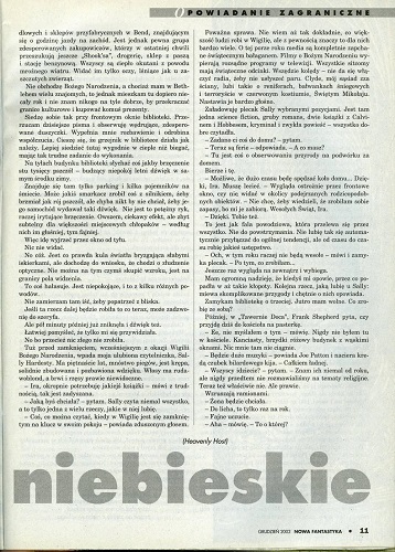 2. Рассказ американской писательницы Нины Кирики Хоффман/Nina Kiriki Hoffman, который называется в оригинале “Heawenly Host” (1997, ант. “First Contact”), перевела на польский язык под названием “Zastępy niebieskie/Сонмы небесные” ИЗАБЕЛЯ МИКША/Izabela Miksza (стр. 10-16). Иллюстрации МОНИКИ РОКИЦКОЙ/Monika Rokicka.