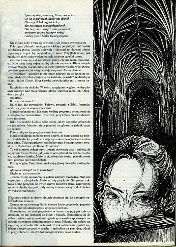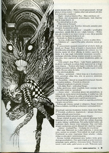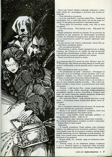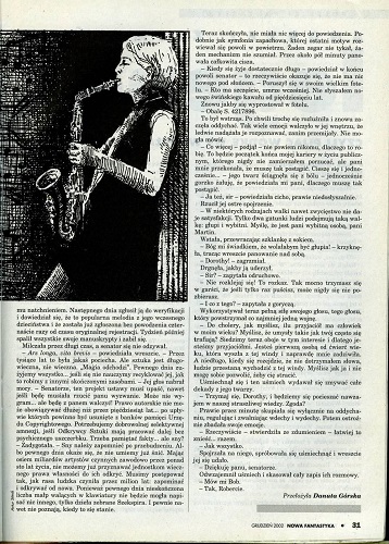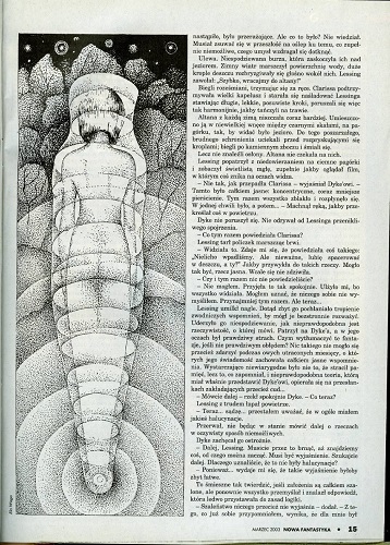 1. Рассказ британского писателя Йена Макдональда/Ian McDonald, который называется в оригинале “Fragments of an Analysis of a Case of Histeria” (1991, ант. “Tales of the Wandering Jew”; 1992, ант. “The Year’s Best SF: Ninth Annual Collection”: 1992, авт. сб. “Speaking in Tongues”), перевел под названием “ Fragmenty analizy pewnego przypadku histerii/Фрагменты анализа припадка истерии” АРКАДИУШ НАКОНЕЧНИК/Arkadiusz Nakoniecznik (стр. 48-56). Иллюстрации КШИШТОФА ГАВРОНКЕВИЧА/Krzysztof Gawronkiewicz.