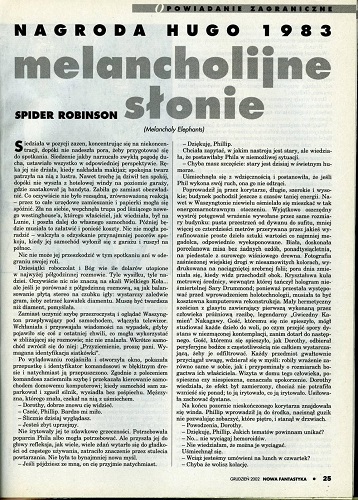 3. Рассказ американского писателя Спайдера Робинсона/Spider Robinson, который называется в оригинале “Melancholy Elephants” (1982, ”Analog Science Fiction/Science Fact”, June; 1984, авт. сб. “Melancholy Elephants”; 1989, ант. “The New Hugo Winners”), перевела на польский язык под названием “Melancholijne słonie/Слоны-меланхолики” ДАНУТА ГУРСКАЯ/Danuta Górska (стр. 25-31). Иллюстрации АРТУРА СИТНИКА/Artur Sitnik.