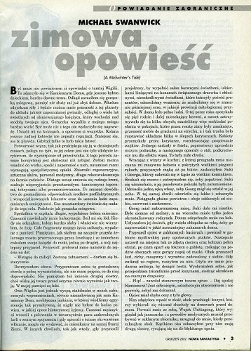 1. Рассказ американского писателя Майкла Суэнвика/Michael Swanwick, который в оригинале называется “A Midwinter’s Tale” (1988, “Isaac Asimov’s SF Magazine”, Dec.; 1989, ант. “Spirits of Christmas”; 1991, авт. сб. “Gravity’s Angels”), перевел на польский язык под названием “Zimowa opowieść/Зимняя сказка” МИХАЛ ЯКУШЕВСКИЙ/Michał Jakuszewski (стр. 3-9). Иллюстрации ЭЛИ ВАГИ/Ela Waga.