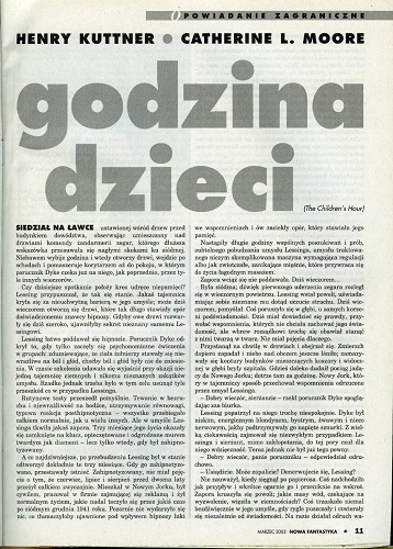 2. Рассказ американских писателей Генри Каттнера/Henry Kuttner и Кэтрин Мур/Catherine L. Moore, который называется в оригинале “The Children’s Hour” (1944, “Astounding SF”, March; 1959, ант. “4 for the Future”; 2015, авт. сб. “Detour to Otherness”), перевела на польский язык под названием “Godzina dzieci/Детский час” ИВОНА ЖУЛТОВСКАЯ/Iwona Żółtowska (стр. 11 – 16; 25 – 36). Иллюстрации ЭЛИ ВАГИ/Ela Waga.