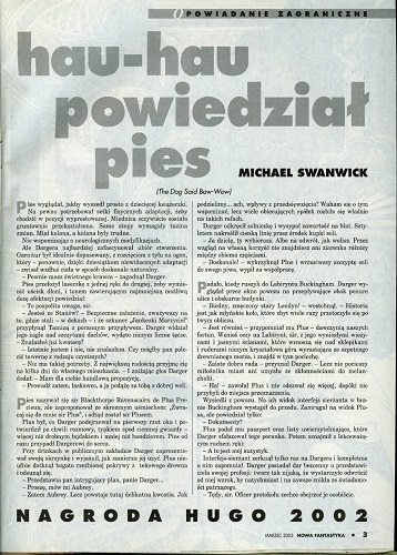 1. Рассказ американского писателя Майкла Суэнвика/Michael Swanwick, который называется в оригинале “The Dog Said Bow-Wow” (2001, “Isaac Asimov’s SF Magazine”, Okt.-Nov.; 2002, ант. “SF The Best of 2001”; 2007, авт. сб. “The Dog Said Bow-Wow”), перевела на польский язык под названием “Hau-hau powiedział pies/Гав-гав сказал пес” ДАНУТА ГУРСКАЯ/Danuta Gurska (стр. 3 – 10). Иллюстрации МОНИКИ РОКИЦКОЙ/Monika Rokicka.