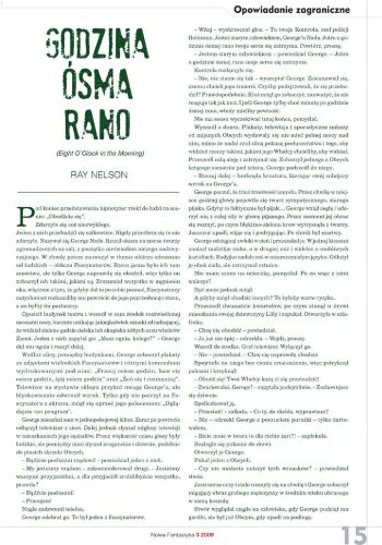 12.1. Короткий рассказ американского писателя Рэя Нельсона/Ray Nelson, который называется в оригинале “Eight O’Clock in the Morning” (1963, “The Magazine of Science Fiction and Fantasy”, Nov.; 1964, ант. “The Best From Fantasy and Science Fiction”; 1969, ант. “The Others”, 2000, ант. “Aliens Among Us”), перевел на польский язык под названием “Godzina ósma rano/Восемь утра” КАРОЛЬ ВИСЬНЕВСКИЙ/Karol Wiśniewski (стр. 15—16). Иллюстраций нет.