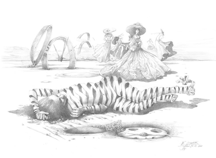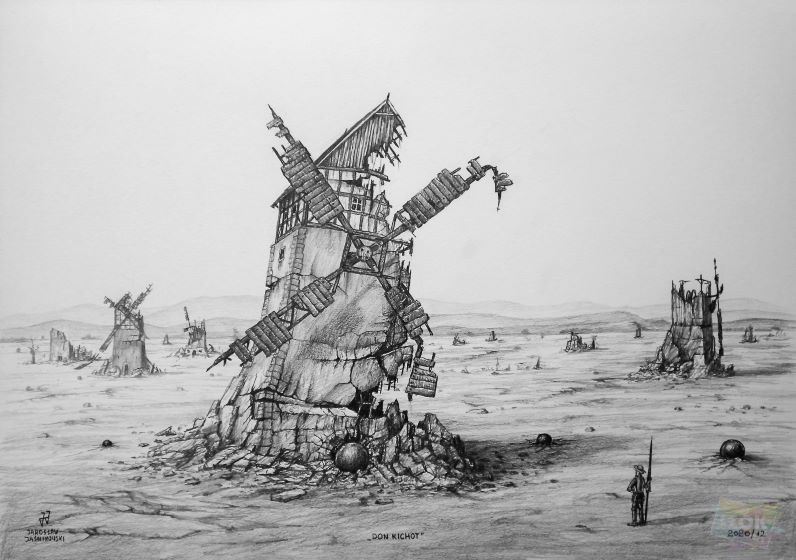 В прошлом году в культурном центре «Атенео» в Мадриде прошла выставка моих рисунков под названием «Дон Кихот – рыцарь будущего». Произведение Сервантеса является самой читаемой книгой в мире, которая содержит необычайный анализ человека эпохи Возрождения, но также и современности. Под маской иронии и остроумия она скрывает правду о человеке, которую когда-то нельзя было раскрыть и выразить прямо. Эта идея является генезисом моей работы. Выставка будет показана в этом году на родине Сервантеса – в Алькала-де-Энарес. Ее следующими остановками будут Мадрид, Варшава или Париж, а приглашающими будут посольства Испании и Институт Сервантеса.
