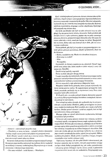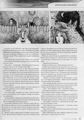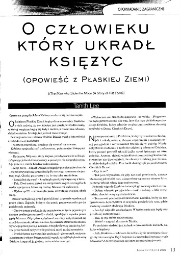 11.1. Новеллу британской писательницы Танит Ли/Tanith Lee, которая входит в состав цикла произведений «Сага о Плоской земле» и называется в оригинале “The Man Who Stole the Moon” (2001, “Realms of Fantasy”, Feb.; 2002, ант. “Years Best Fantasy 2”; 2013, ант. “The Mammoth Book of Angels and Demons”), перевел на польский язык под названием “O człowieku ktróry ukradł księżyc/О человеке, укравшем Луну” МИХАЛ ЯКУШЕВСКИЙ/Michał Jakuszewski (стр. 13-24). Иллюстрации АРКАДИУША КЛИМЕКА/Arkadiusz Klimek.