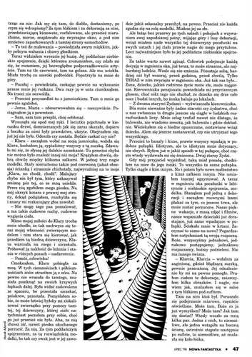 С огромным опозданием выходит этот самый первый номер журнала “Fantastyka”, якобы октябрьский. В ноябре появляется наконец в киосках, и отец скептически замечает: Не нравится мне “Fantastyka” – журнал скучный, без иллюстраций. (…) Удержится ли он на рынке? В нем так много американизмов.