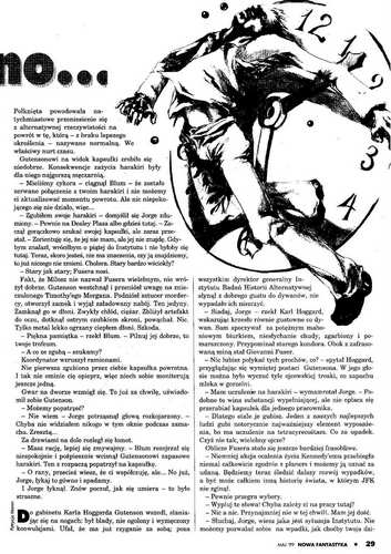 13. В рубрике «НФ в мире» Анна Дорота Каминьская/Anna Dorota Kamińska реферирует январский 1998 года номер журнала ”Ikarie”, некто (anak) рассказывает об интересных публикациях в мартовском 1998 года номере журнала “Locus”, Кшиштоф Цыркот/Krzszysztof Zyrkot разбирается с февральским 1998 года номером журнала “Analog”, а Доминика Матерская/Dominika Materska и Ева Попелек/Ewa Popiolek внимательно разглядывают мартовский и майский 1998 года номера двумесячника “Science Fiction Age” (стр. 74).