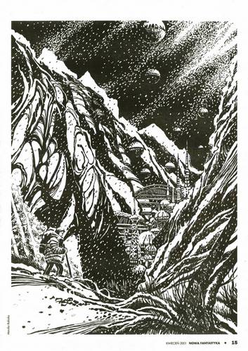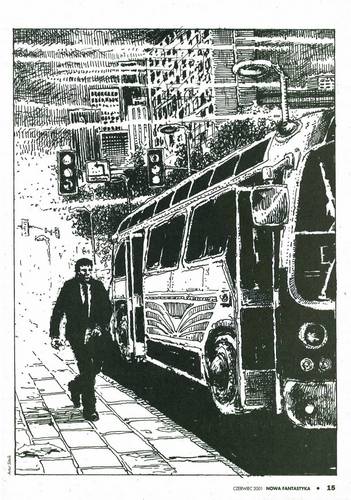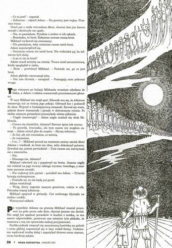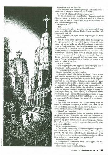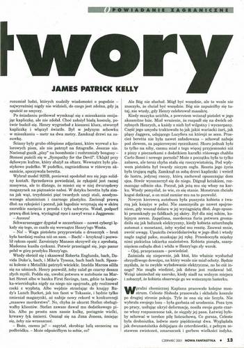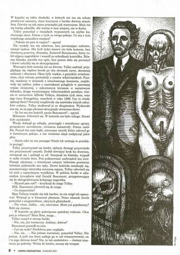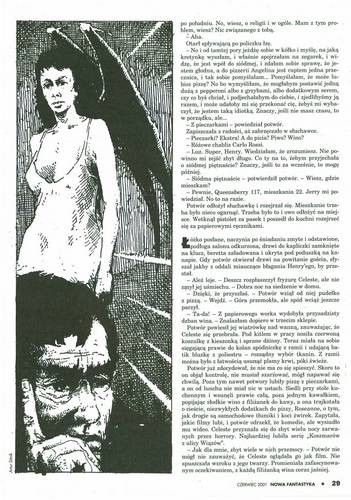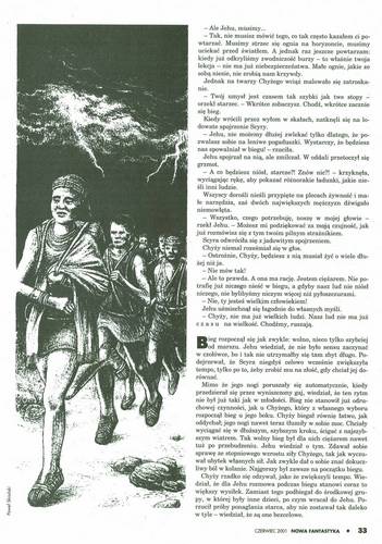2. Рассказ американского писателя Джеймса Патрика Келли/James Patrick Kelly, который называется в оригинале “Monsters” (1992, “Asimov’s Science Fiction”, June; 1996, ант. “Paragons: Twelve Master SF Writers Ply Their Craft”; 1997, авт. сб. “Think Like A Dinosaur and Other Stories”), перевел на польский язык ТОМАШ ГАЛОНЗКА/Tomasz Gałązka под названием “Potwory/Чудовища” (стр. 12-26, 25-30). Иллюстрации АРТУРА СИТНИКА/Arthur Sitnik.