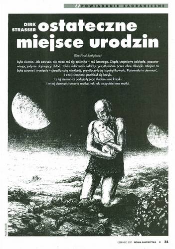 3. Рассказ австралийского писателя Дирка Штрассера/Dirk Strasser, который называется в оригинале “The Final Birthplace” (1991, ”Aurealis”, № 3; 2014, авт. сб. “Stories of the Sand”) перевел на польский язык под названием “Ostateczne miejsce urodzin/Конечное место рождения” ПАВЕЛ МАРТИН/Paweł Martin (стр. 31-36). Иллюстрации ПАВЛА СКРОНЬСКОГО/Pawieł Skroński.