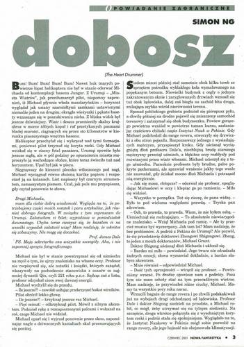 1. Рассказ австралийского писателя Саймона Нг/Simon Ng, который называется в оригинале “The Hearth Drummer” (1999, ”Eidolon”, Winter), перевела на польский язык под названием “Dobosz/Барабанщик” АГНЕШКА ФУЛИНЬСКАЯ/Agnieszka Fulińska (стр. 4-11). Иллюстрации МОНИКИ РОКИЦКОЙ/Monika Rokicka.