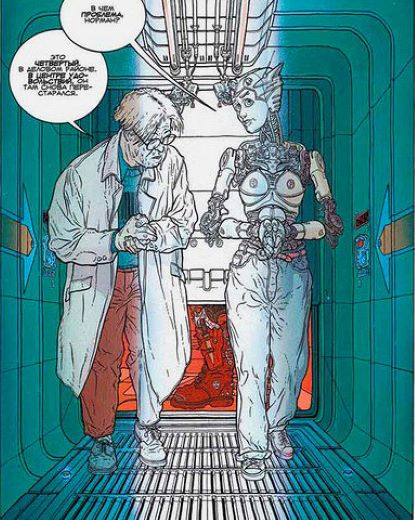 Короче говоря, “Hard Boiled” — это история об андроиде, который не способен восстать против человеческого правления, и несмотря на неоднократные попытки разобраться, все же не может осознать, кто он такой на самом деле. При этом каждая такая попытка заканчивается гибелью нескольких сотен человек и сокрушительным разрушением общественной собственности. Может сложиться впечатление, что сценарий — всего лишь предлог для показа множества разнообразных образов насилия, а сам Миллер сочинил его, чтобы дать выход своей энергии, не вложенной в умеренно успешные экранизации двух частей «Робокопа», для которых он написал сценарии. К счастью, ситуацию спасает ДЭРРОУ, который приспособил историю под свои нужды, создал ее в эржевской ligne claire и тщательно наполнил кадры ошеломляющим количеством деталей. На ста двадцати восьми страницах размещены целых восемь двухстраничных и двадцать восемь одностраничных панелей, под завязку набитых людьми, мусором, гильзами, пулевыми отверстиями, рекламой, надписями и т. д. Деталей в одном кадре больше, чем диалогов во всем комиксе. Блестящей работой иллюстратора можно любоваться часами, неоднократно и каждый раз с неустанным восхищением.