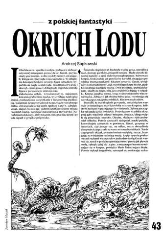 5. В рубрике «Из польской фантастики» в номере публикуется очередная новелла Анджея Сапковского о ведьмаке Геральте «Okruch lodu». Вот что пишет о ней сам Сапковский: «Дженнифер не видит ничего безнравственного в том, что она делит постель с кем захочет и когда захочет. Ревность Истредда и Геральта кажется ей смешной, жалкой, несовременной и лишенной смысла. Такая ревность ставит их на один уровень с темным деревенским мужичком или глупым мещанином, у которых есть конкретные причины требовать верности от жены – они боятся появления внебрачных детей, ублюдков, которые могут претендовать на наследование земли или имущества, боятся подхватить от неверной жены дурную болезнь, боятся презрения соседей. “Но вам то, парни, что до этого? – удивленно спрашивает Йеннифер. -- Ни я, ни вы не способны завести ребенка, мы стерильны, как камни, у нас иммунитет ко всем болезням, а чужим мнением мы давно перестали интересоваться. Поэтому просите у меня прощения за ваше глупое поведение, я не понимаю его причин”. Когда Йеннифер поймет эти причины, будет уже поздно». Рассказ неплохо проиллюстрировал ЯРОСЛАВ МУСЯЛ/Jarosław Musiał. Здесь показан первый из четырех рисунков.