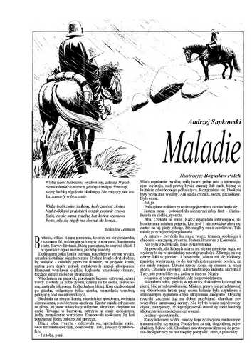 Новый рассказ Сапковского, печатающийся в журнале – весьма своеобразная вариация кельтской легенды о Тристане и Изольде. Иллюстрации БОГУСЛАВА ПОЛЬХА/Bogusław Polch. Позже рассказ вошел в авторские сборники “Swiat króła Arthura. Maladie/Мир короля Артура. Maladie” (1995), “Maladie” (2006) и “Maladie i inne opowiadania” (2012)