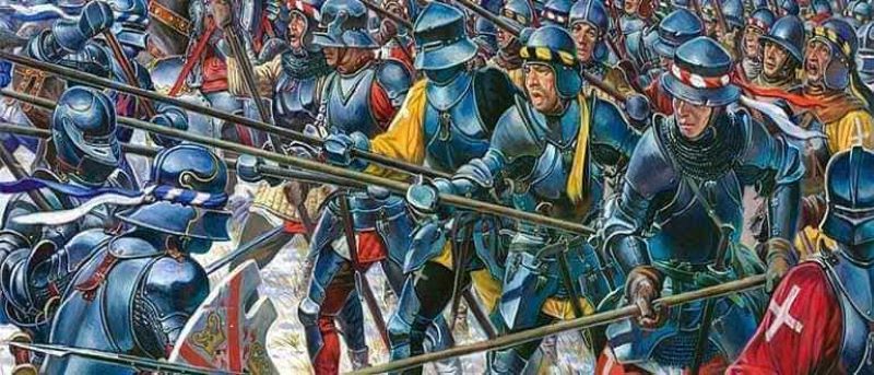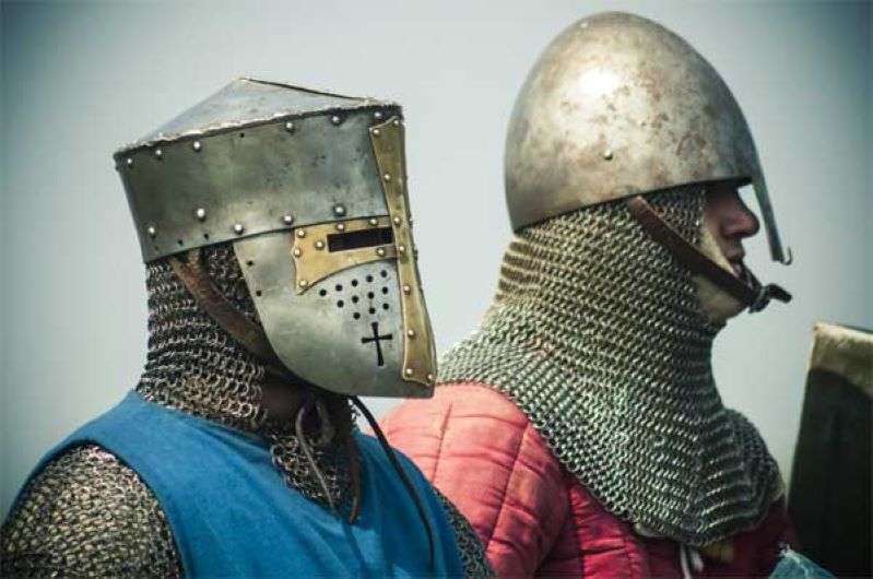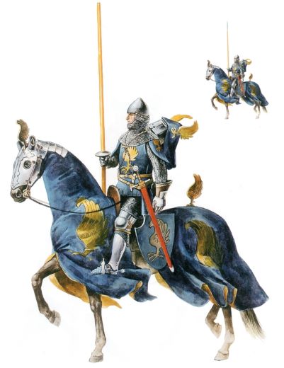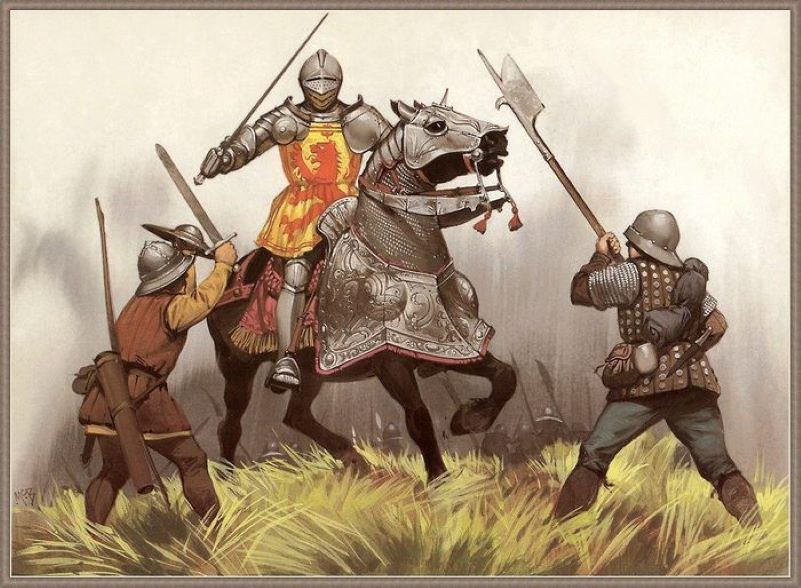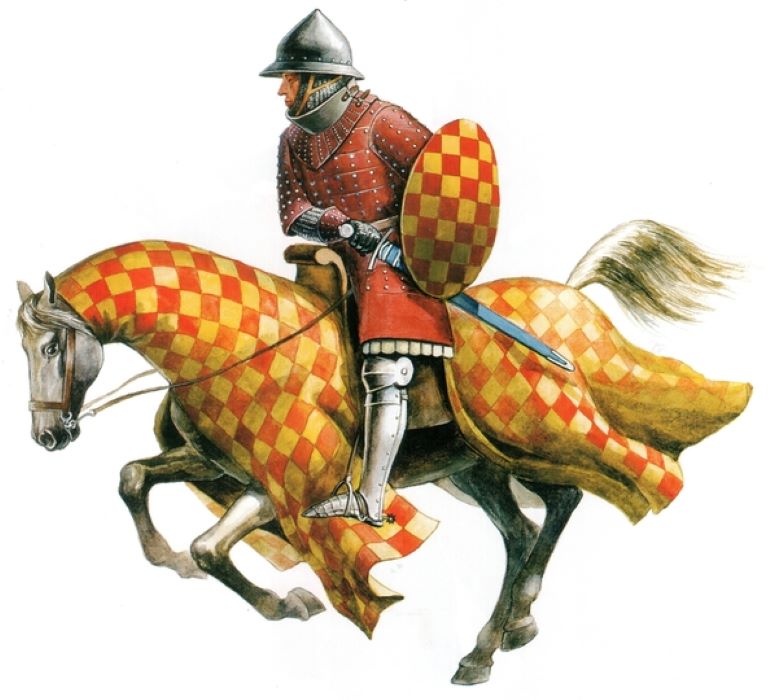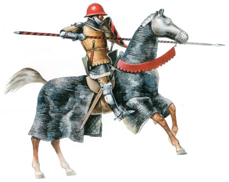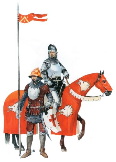 Пришла пора внимательнее присмотреться к внешнему виду и вооружению отдельных бойцов. Вопреки распространённому мнению, они не носят доспехи целый день, даже во время военной кампании. Этот наряд слишком тяжел и неудобен, в его полную версию облачаются только перед битвой или тогда, когда существует риск нападения (например, на марше или в карауле), в повседневности же используются только отдельные защитные элементы: шлемы, латные перчатки и стеганые кафтаны (гамбезоны).