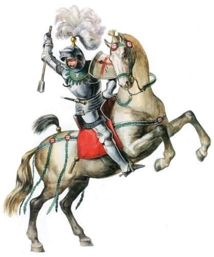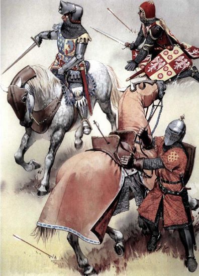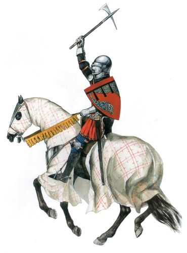 После первого же удара копье обычно разбивается в щепы, и тогда всадник хватается за висящее на его боку оружие, которым может быть меч, но также топор или булава.