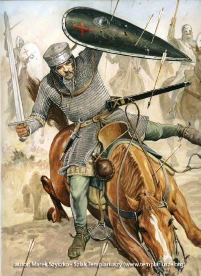 Доспех дополняется щитом, обычно чем больших размеров, чем слабее надетая на воине броня. Щиты имеют выпуклую форму и изготавливаются путем склеивания впритык профилированных досок и обивки их деревом или обшивки кожей. Рыцарские щиты обычно небольшие и треугольной формы, а солдатские чаще всего представляют собой так называемые павезы -- большие щиты, способные закрывать чуть ли не все тело, прямоугольной или овальной формы. Особенно полезны они арбалетчикам, которые, поставив их на землю, могут стрелять из арбалетов из-за такого укрытия.